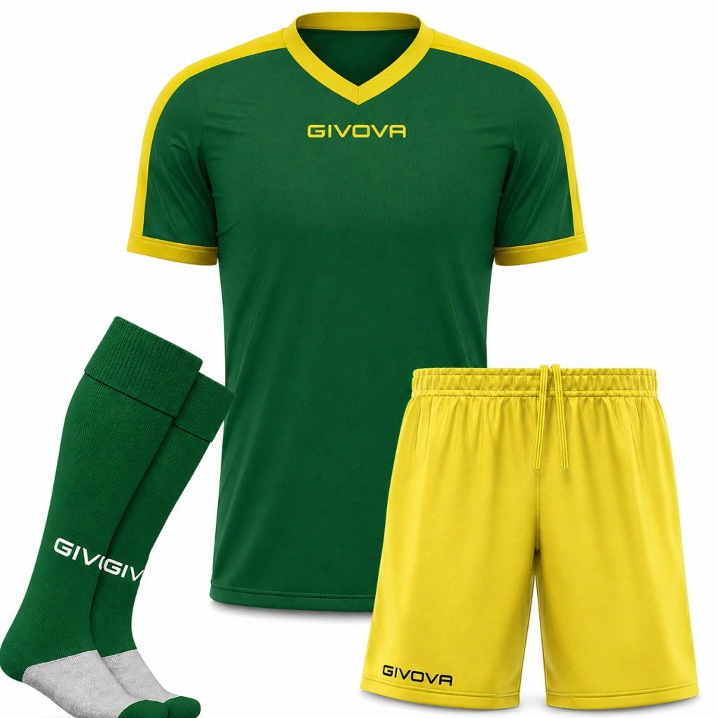 Zápasový set Givova Revolution (dres Revolution + trenky Capo + štulpny) je ideální volbou pro fotbalové kluby, týmy, školy i kempy. Set obsahuje kompletní zápasovou výbavu – dres, trenky a štulpny, vyrobené z lehkého, prodyšného a odolného materiálu pro maximální komfort při zápase i tréninku. Díky možnosti potisku, klubových cen a vizualizace zdarma je perfektní pro vybavení celého týmu.