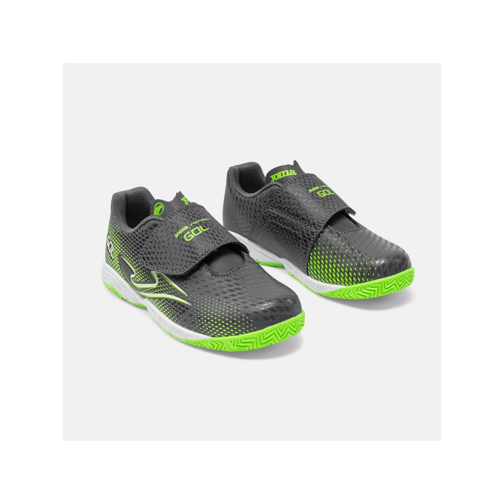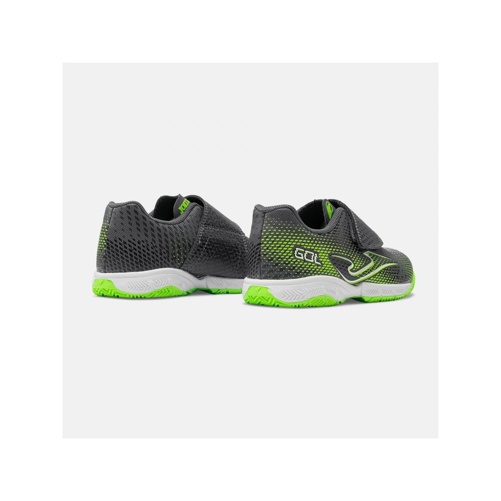 Model Joma GOL JR 2622 DARK GRAY INDOOR je ideální volbou pro mladé hráče, kteří potřebují stabilitu, pohodlí a jistotu pohybu na halovém povrchu. Kombinace tmavě šedé barvy s výraznými zelenými prvky dodává botám moderní sportovní vzhled.